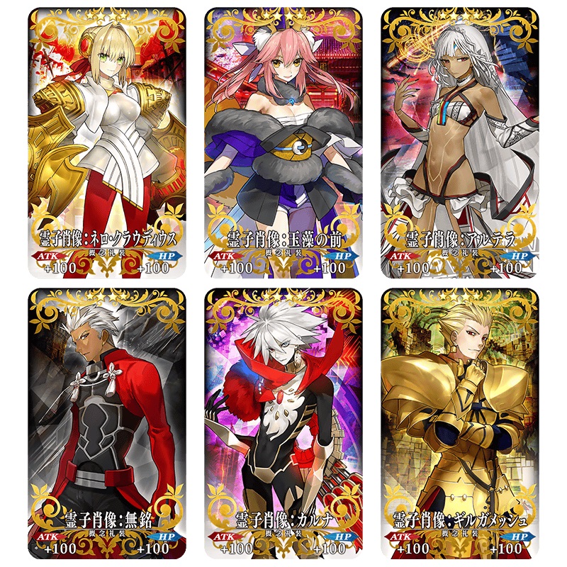 ★5(SSR)アルテラ(セイバー)、★5(SSR)アルトリア・ペンドラゴン(セイバー)、★4(SR)ガウェイン、★4(SR)ネロ・クラウディウス(セイバー)、★5(SSR)アルジュナ、★5(SSR)ギルガメッシュ(アーチャー)、★4(SR)エミヤ(アーチャー)、★3(R)ロビンフッド、★5(SSR)カルナ、★5(SSR)スカサハ(ランサー)、★4(SR)エリザベート・バートリー(ランサー)、★4(SR)李書文、★3(R)クー・フーリン(ランサー)、★5(SSR)イスカンダル、★5(SSR)フランシス・ドレイク、★4(SR)アストルフォ、★3(R)メドゥーサ(ライダー)、★5(SSR)玉藻の前(キャスター)、★3(R)ジル・ド・レェ(キャスター)、★4(SR)ランスロット(バーサーカー)、★3(R)ダレイオス三世、★3(R)呂布奉先、★5(SSR)ジャンヌ・ダルク(ルーラー)