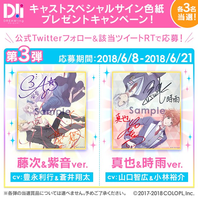 2018年のアプリ配信に先駆けて開催中のTwitterキャンペーンでは、公式Twitterアカウント(@colopl_dreaming)をフォローし、対象ツイートをリツイートすると、キャラクターボイスを担当している豪華キャスト陣の直筆サイン色紙が抽選でそれぞれ3名に当たる。第3弾は、豊永利行さん、蒼井翔太さん、山口智広さん、小林裕介さんのサイン色紙。応募期間は6月21日(木)までとなっている。