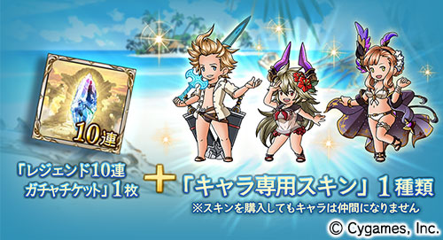 本キャンペーンでは、十天衆の“シエテ”、“ソーン”、“サラーサ”の3種類のスキンが登場。“レジェンド10連ガチャチケット”1枚と“キャラ専用スキン”1種類のセットを3,000モバコイン、3,000グラブルコイン、3,000GREEコイン、または3,000DMMポイントで購入することができる。
