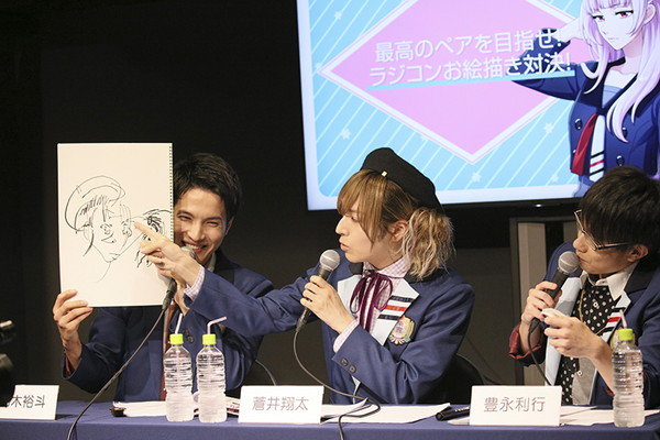 出来上がったイラストが披露されると、会場は大爆笑に包まれました。髪と帽子の各パーツが上手く交わらず、どこかホラーテイストに。とはいえ、それ以外は似顔絵の完成度が非常に高く、ゲストのおふたりも満足した様子でした。