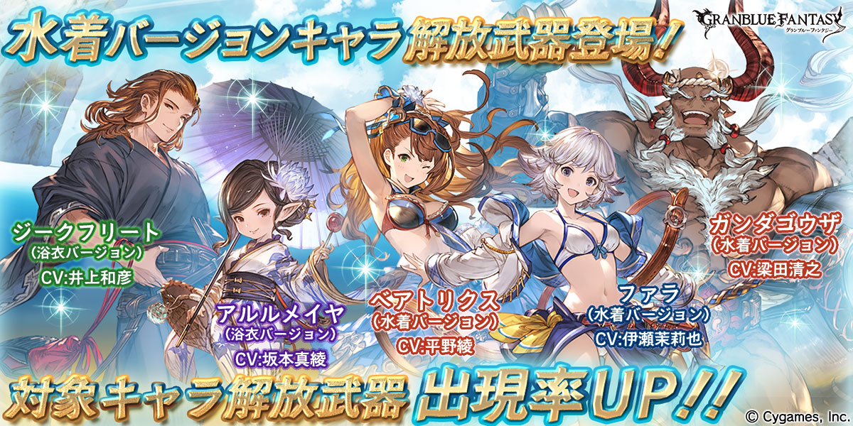登場するのは、期間中ジークフリート(浴衣バージョン)、ベアトリクス(水着バージョン)、ガンダゴウザ(水着バージョン)に加えて、新たにファラ(水着バージョン)、アルルメイヤ(浴衣バージョン)の解放武器だ。