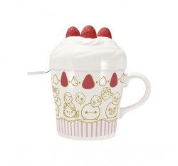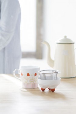 クリームの間で楽しそうにはしゃぐ「ツム」たちをデザインした、フタと茶こし付きのマグカップです。フタをひっくり返すと小皿としても使えます。