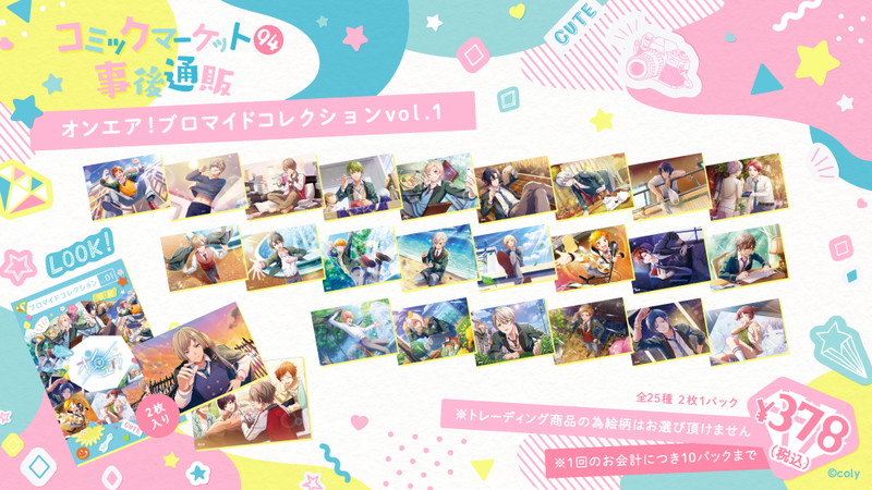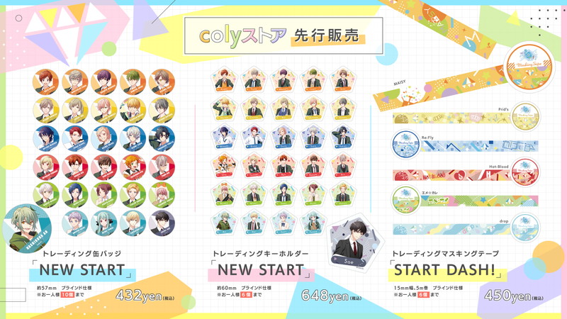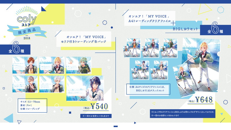 公式ホームページにて各ユニットのエースたちが美麗イラストとなった“MY VOICE”シリー ズは、colyストアでの限定発売となる。エースたちのきらめきに満ちたセリフ付のトレー ディング缶バッジと、美麗イラストの全身画を楽しめるA4クリアファイル+BIGしおりセットも登場。他にも『オンエア!』初のトレーディングキーホルダー(全30種)やトレーディングマスキングテープ(全6種)が先行発売で登場している。