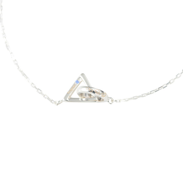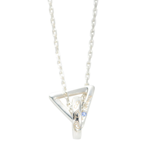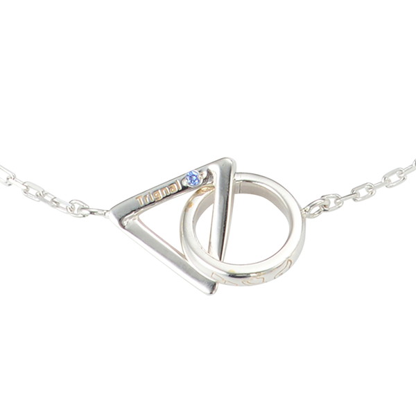 ユニットをイメージしたトライアングルモチーフがリングと交差したデザイン。 トップには江口拓也さん、木村良平さん、代永 翼さんのイメージアイコン刻印が施され、 イメージカラーのストーンがセット。シンプルなデザインなので普段使いにもぴったりのネックレスとブレスレットだ。