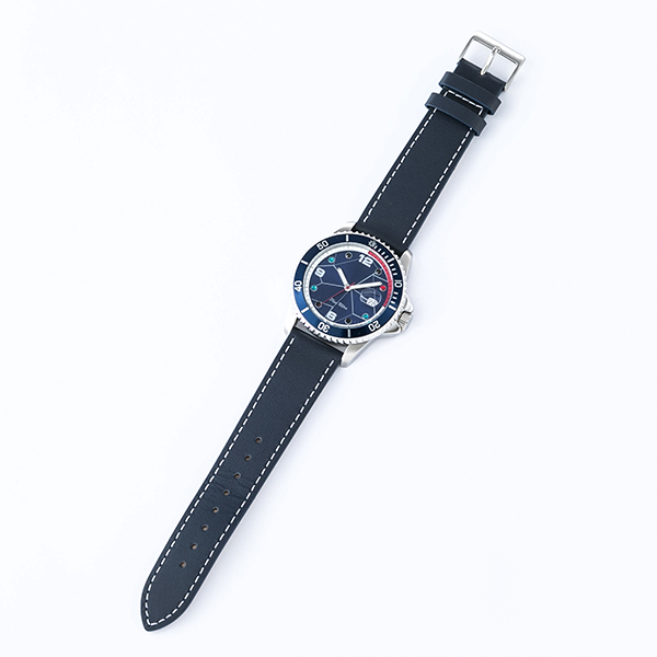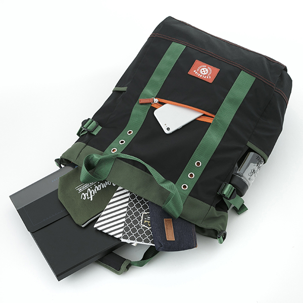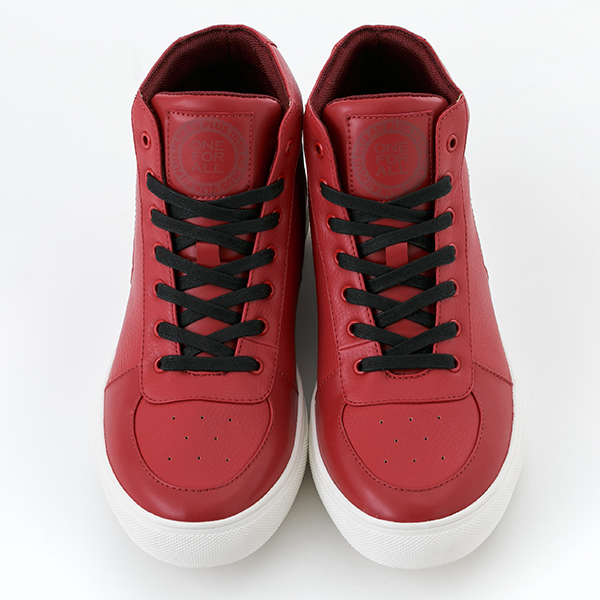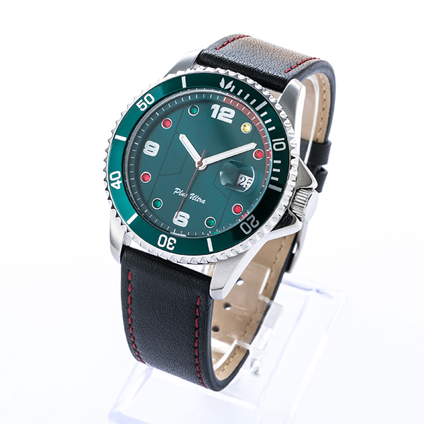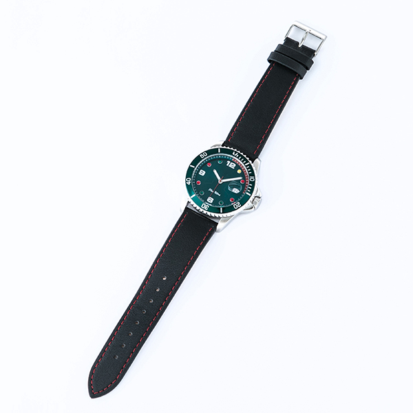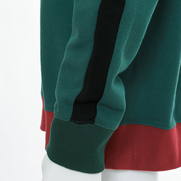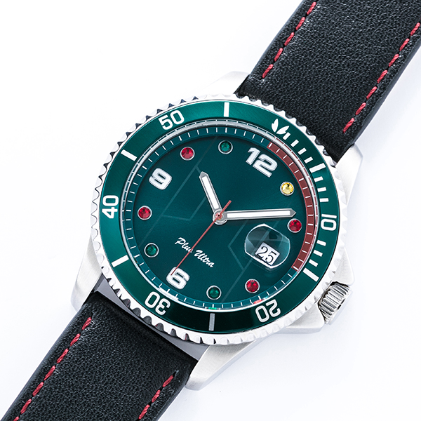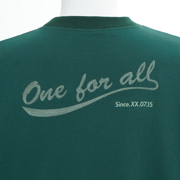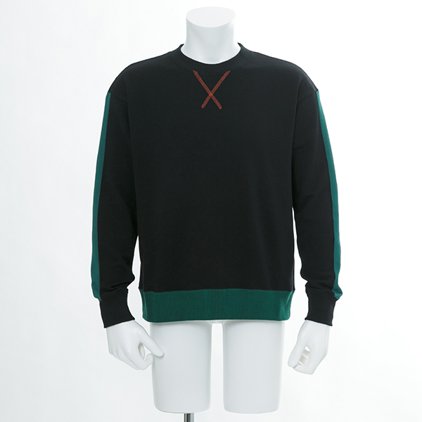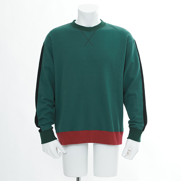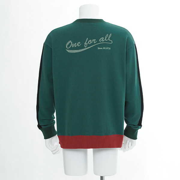 デクのヒーローコスチュームのようなグリーン×レッドのリブがアクセントになったトレーナーに、フォルムとカラーにこだわった真っ赤なスニーカーを合わせてカジュアルに! スポーティで大人っぽいダイバーズウォッチ風の腕時計や、リュックにもショルダーにもなる便利なバッグも登場。