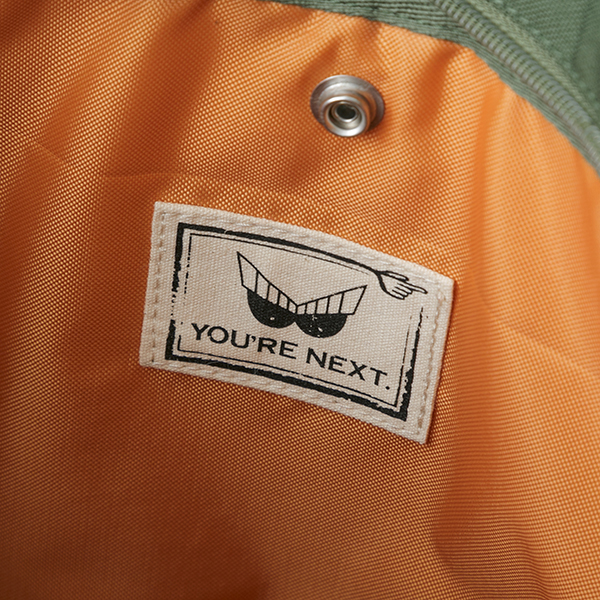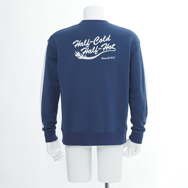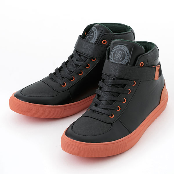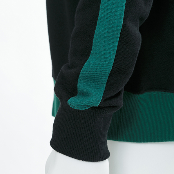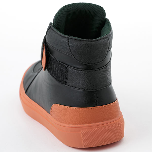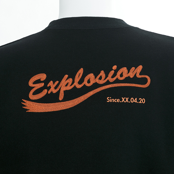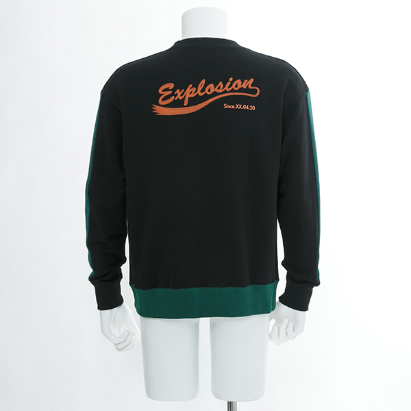 爆豪の胸元風のオレンジのラインや、ベルト風のグリーンのリブがポイントのトレーナー。スニーカーはオレンジ色のソール&シューレースホールが爆豪のブーツとお揃い! ブラックベースにアクセントカラーが効いたクールなコーデに仕上がる。