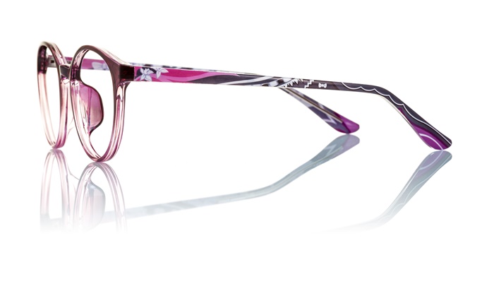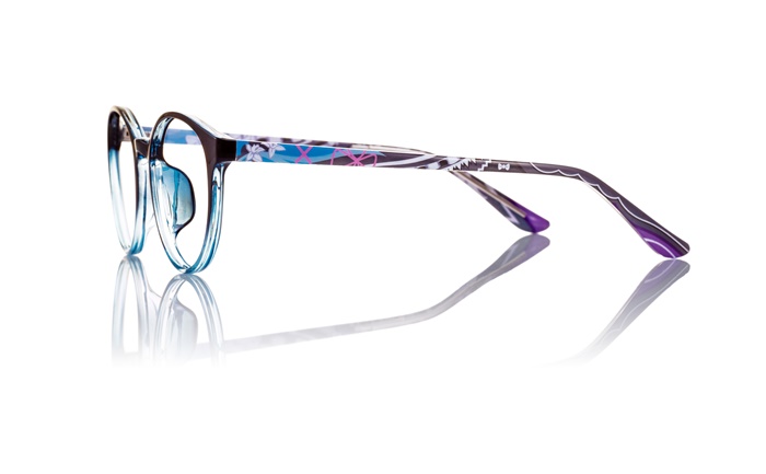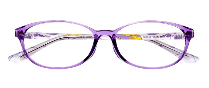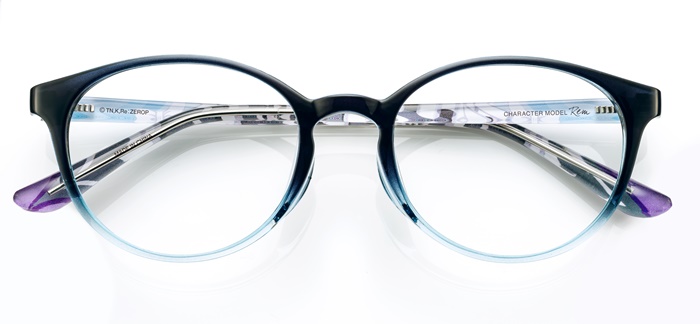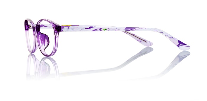 フロント部分はヒロインらしい女性的なオーバル型を採用。エミリアの瞳のパープルをベースカラーとして、テンプル部分は彼女の衣装を流れるようなモチーフで表現。テンプル端の髪留めデザインがアクセントになっている。