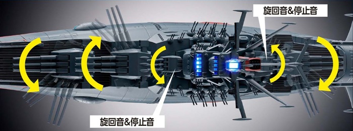 また、主人公の古代 進(CV.小野大輔氏)とヒロイン森 雪(CV.桑島法子氏)、島 大介(CV.鈴村健一氏)の新規収録のセリフ音声を搭載し、各種効果音や劇中の音楽を、リモコン操作により臨場感たっぷりに楽しむことができる。新技術“モーションリアクトサウンドシステム(日本特許出願済)”を採用し、砲塔をリモコン操作することで、旋回に合わせて複数の効果音を再生する。