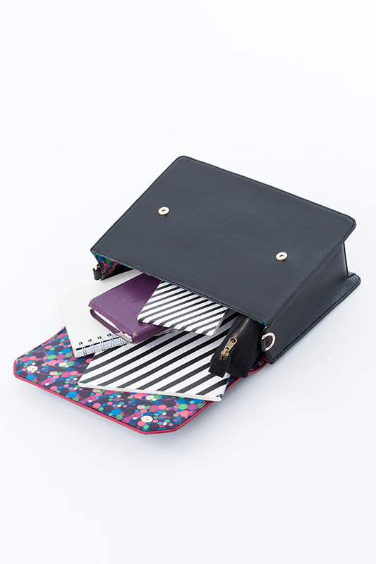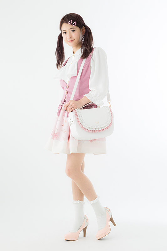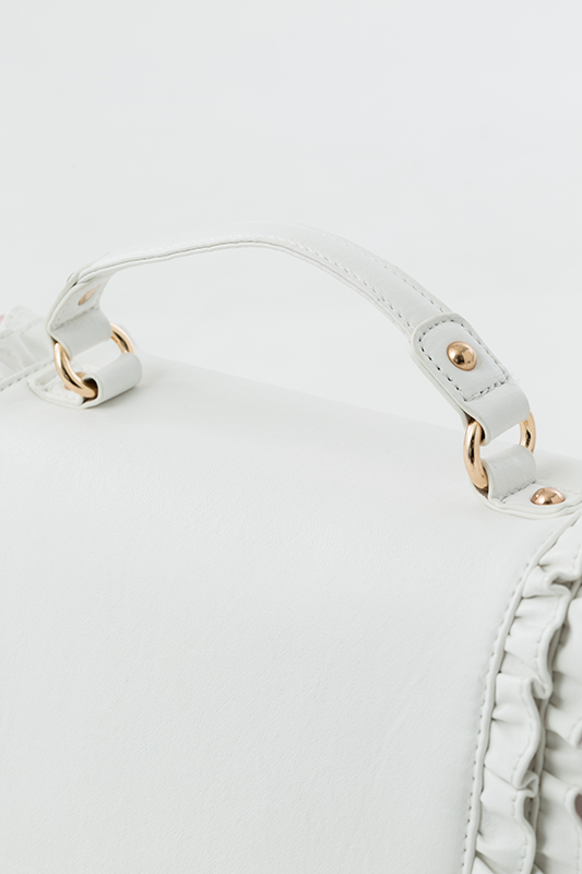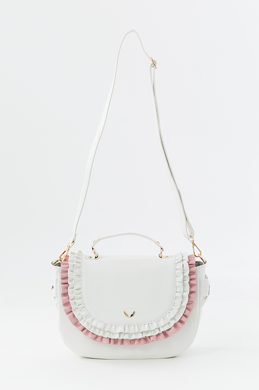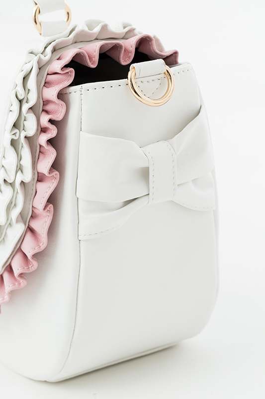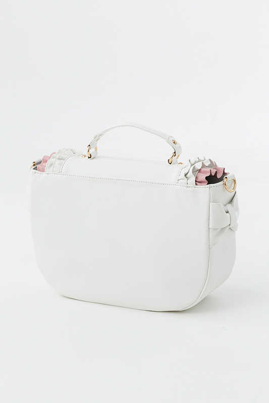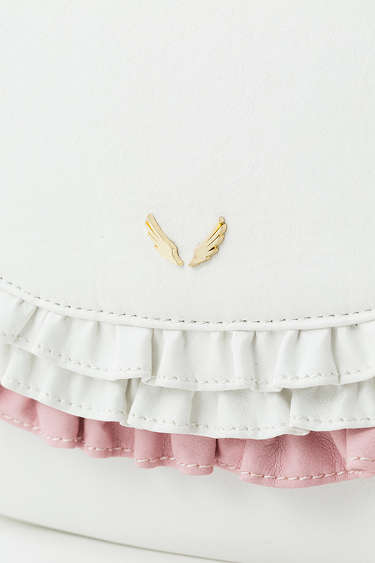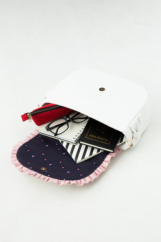 スカートをイメージしたフリルたっぷりフラップはピュアなホワイト×ピンクでピュアな印象を与えてくれる。さりげなくワンポイントであしらわれているまどかの背中の羽は、オリジナルのプレートが使用されている。サイド部分のリボンは、まどかの髪飾りをイメージ。バッグの裏地は、まどかのスカートの内側にある宇宙をイメージしたオリジナルプリント。ノートや手帳などの持ち物が収納可能だ。