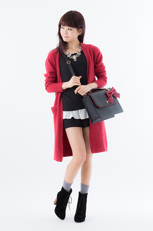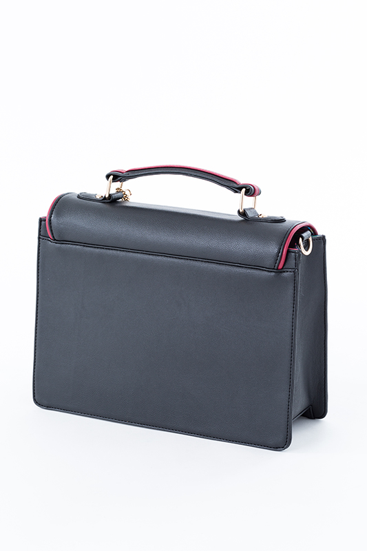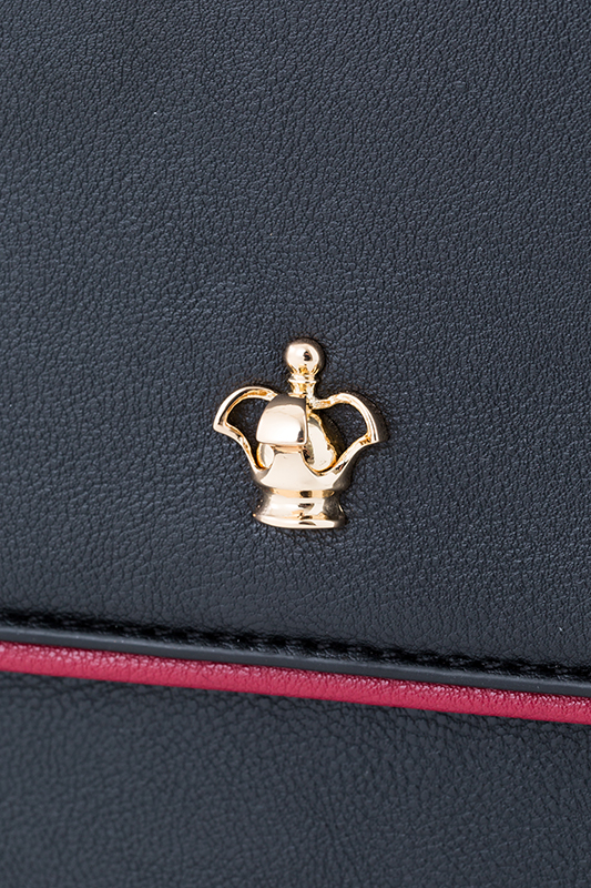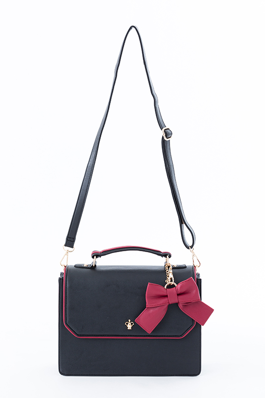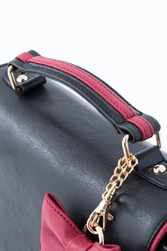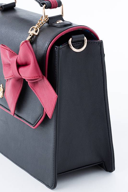 かっちりとした印象のスクエア型のハンドバッグ。ブラックベースに映える真紅のリボンがポイントとなっている。フラップ部分には、ダークオーブがあしらわれており、細部まで忠実に再現したハイクオリティーな作りに注目してほしい。持ち手のライン&リボンチャームはほむらの髪飾りをイメージ、取り外しが可能で気分で付け替えできる。裏地には「呪いよりもおぞましい色」をイメージしたオリジナルプリントを使用。シックなバッグとカラフルな裏地のメリハリのあるデザインのバッグに仕上がっている。