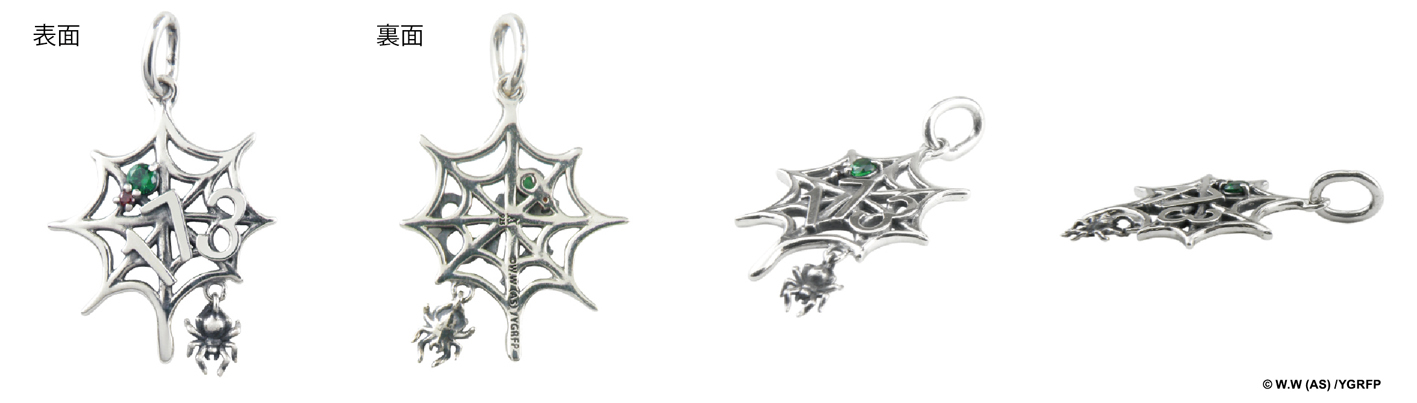 巻島の異名「ピークスパイダー」をイメージしたデザインのペンダントトップ。クモの巣にゼッケン番号「173」をアレンジし、髪色をイメージした緑と赤のストーンをセット。また、繊細な彫り込みをされた小さなクモは、さりげなく揺れる仕様になっています。