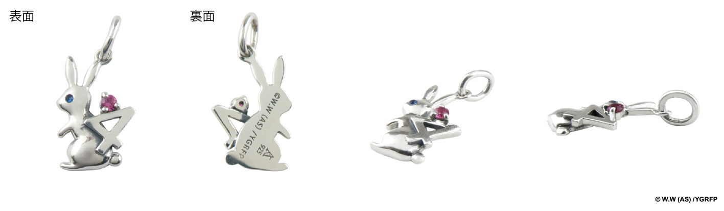 新開がかかいがるウサギをイメージしたデザインのペンダントトップ。ウサギの目は、新開の瞳と同じ濃いブルーカラーがセットされ、ゼッケン番号「4」には彼の髪色を連想させるルビーカラーがセットされています。