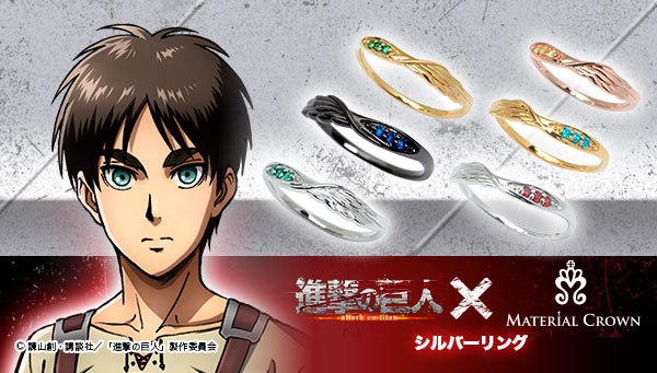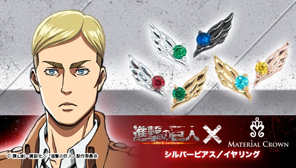 バンダイ公式ショッピングサイト“プレミアムバンダイ”では、アニメ『進撃の巨人』とアクセサリーブランド“MATERIAL CROWN(マテリアルクラウン)”のコラボジュエリー第2弾として、登場キャラクター6人をモチーフにした『シルバーピアス/イヤリング(全6種)』、『シルバーリング(全4種)』、リヴァイの衣装をモチーフにした『シルバーネックレス』の予約受付を9月28日から実施している。