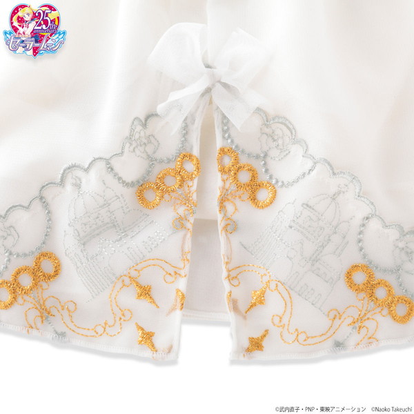 オフホワイトの落ち着いた生地には上品なラメも入っており、チュールレースの奥からさりげなくキラキラと輝く仕様に。ムーンキャッスルやプリンセス・セレニティのモチーフが、上品なゴールド・シルバーの糸で繊細に刺繍されている。ワンポイントにシフォン生地のリボンもあしらわれている。シンプルで落ち着いたデザインの中に、『美少女戦士セーラームーン』の世界観を散りばめた、ロマンティックなリラクシングウェアだ。