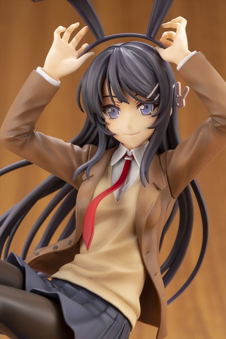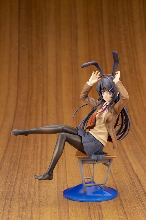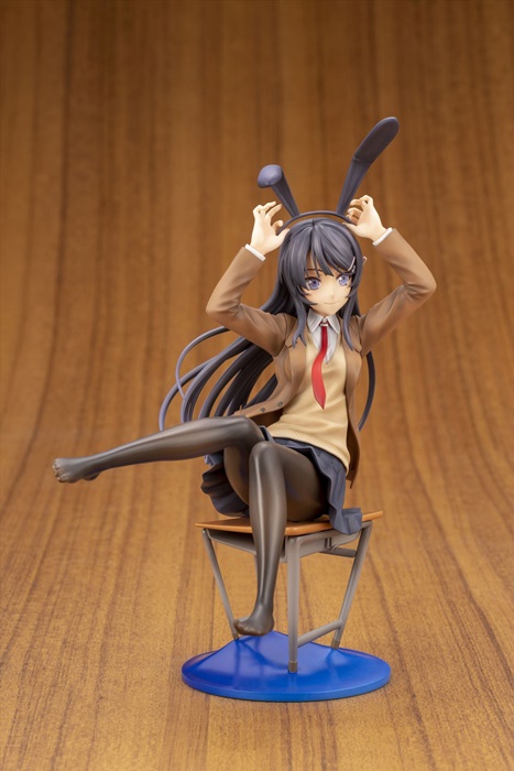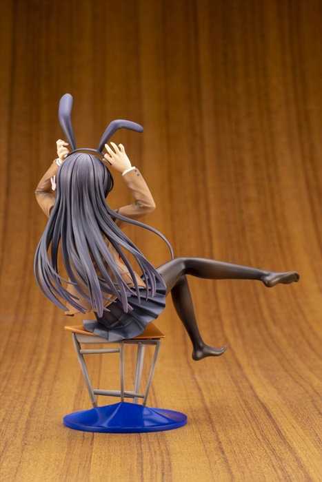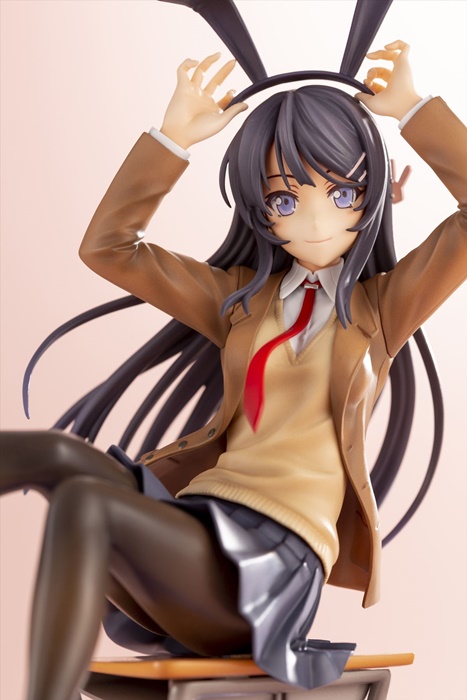 主人公が図書館で出合った野生のバニーガールは、活動休止中の国民的人気タレント・桜島麻衣先輩でした……。お近づきになった先輩がたまに見せる、可愛いからかいの仕草をイメージして立体化。学校の机に腰掛け、ウサ耳を持ちながらいたずらっぽく微笑むポーズ。すらりとした足を包む黒のストッキングは、肌の透け具合にこだわりが込められている。