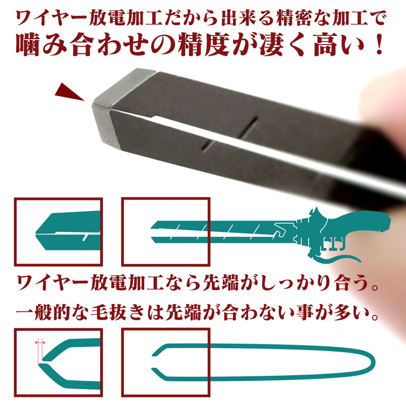 超硬質ブレード毛抜きは、先端の合わせ精度が非常に高く、短い毛でも確実に掴むことができる。