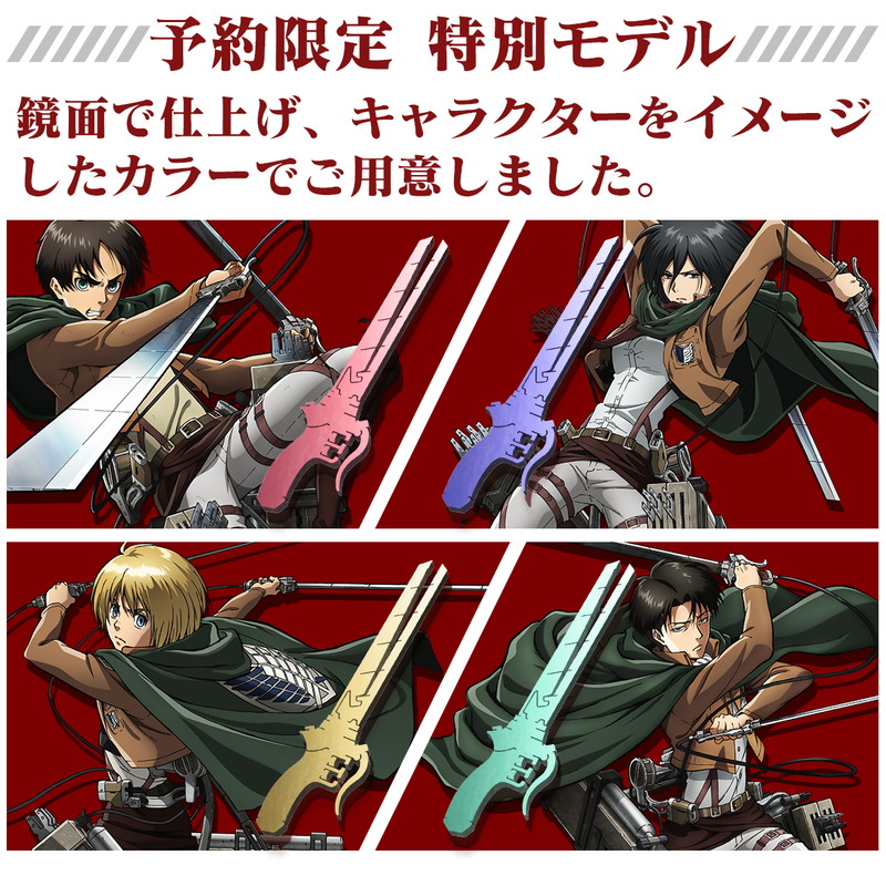 通常版の他に、陽極酸化による着色と鏡面仕上げを行った予約限定モデルも登場。各キャラクターをイメージした色の予約限定モデルを入手することができる。エレン、ミカサ、アルミン、リヴァイverは予約限定販売。10月21日までの予約がおすすめだ。