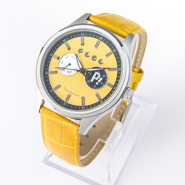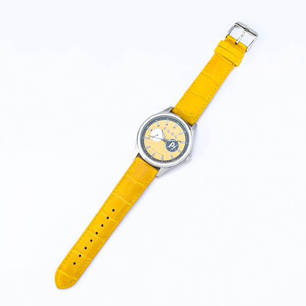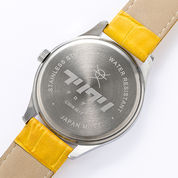 ベルトと盤面は、こちらも鮮やかなイタリアンイエロー。文字盤にそっと入った“FLCL”や“P!”のデザインが嬉しい! 裏蓋にはアトムスクのマークもデザインされている。