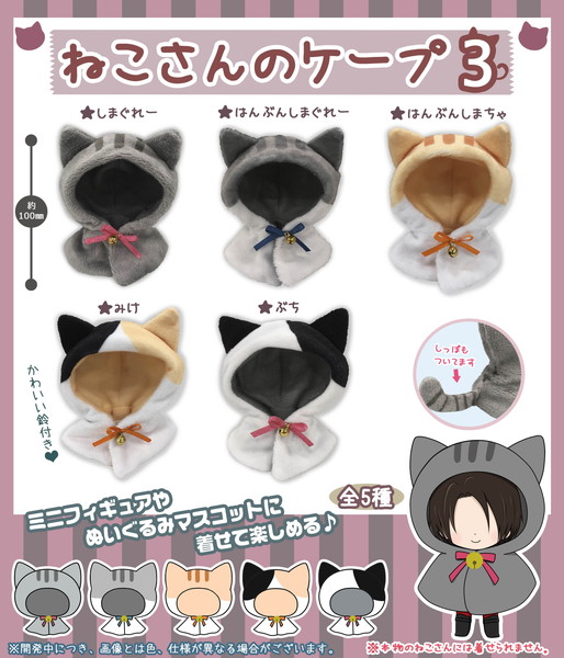 発売当初より大人気のミニフィギュアやミニぬいぐるみマスコットなどに着せて遊べる「ねこさんのケープ」に新作登場。しましま柄や三毛柄ブチ柄も仲間に加わって、可愛さパワーアップ。