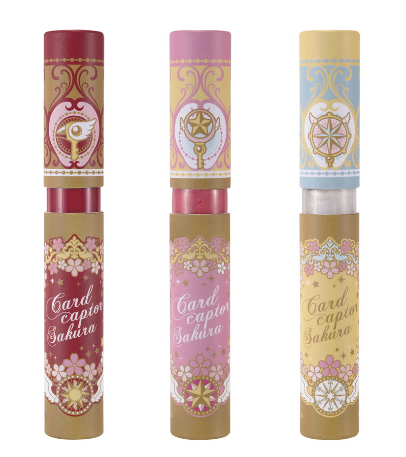 カードキャプターさくらの歴代のシリーズをイメージしたリップグロス。クロウカード編はボルドーレッド、さくらカード編はスモーキーピンク、クリアカード編はさりげなくパールの入ったクリアタイプ。