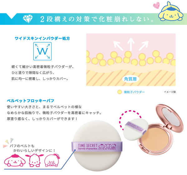 いつどんな時でも高パフォーマンスな仕上がりを追求する、シリーズ累計240万個突破※1の“TIME SECRET”は、高カバー×高キープの最強※2プレストパウダーだ。サンリオの人気キャラクター、ポムポムプリン、タキシードサム、ポチャッコが80年代風のレトロデザインに可愛く仕上げられている。