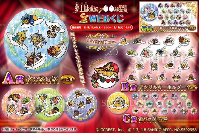 限定グッズがはずれなしで当たる“夢王国と眠れる100人の玉子様 ~ぐでWEBくじ~(夢100×ぐでたま)”では、『夢100』のエイプリルフール企画にて登場した『ぐで玉子様』6人ほか、今回のキャンペーンに向けて新たに描きおろされた14人の『ぐで玉子様』が、書きおろしのセリフとともにクッションやアクリルキーホルダー、缶バッジとなって登場。また、一度のご注文で5枚WEBくじを購入すると“王子様×玉子様缶バッジ”が1つもらえる。