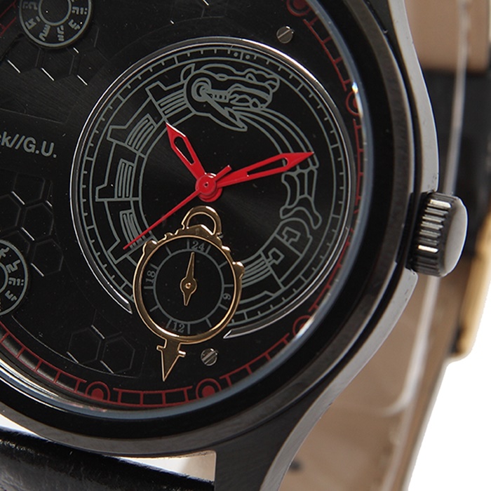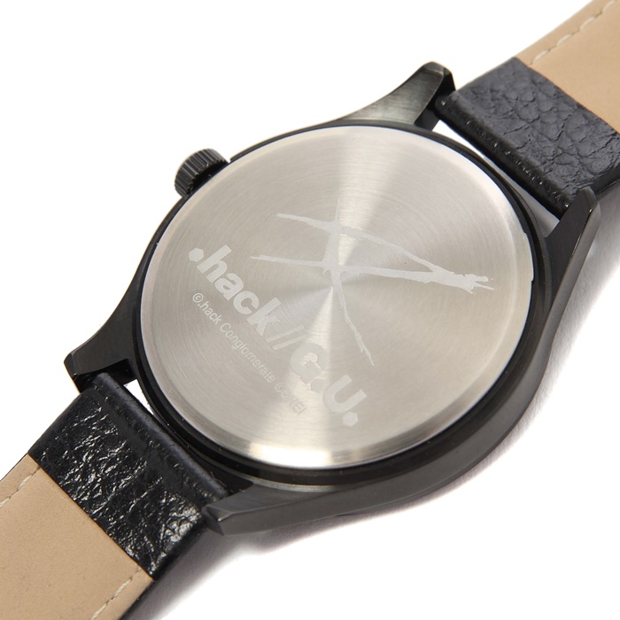 1st formをイメージした、ハセヲらしい真っ黒な腕時計。秒針やステッチの赤がアクセント。盤面には“知識の蛇”のモチーフが施されており、裏蓋には三爪痕(トライエッジ)の爪痕が残されている。