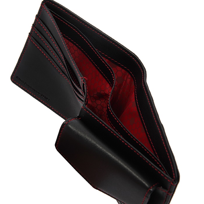 使い勝手の良い小さめの二つ折り財布&お揃いのデザインのカードケース。ハセヲのベルトを再現したデザインと、鎧のような質感の生地でハードな印象の仕上がり。財布の表面にはハセヲのお腹のタトゥーを型押し。内側にはAIDAをイメージした型押しやヘックスパターンが施されている。真っ赤な内装でテンションもUP!