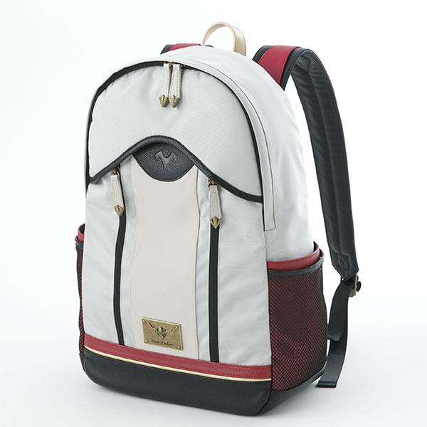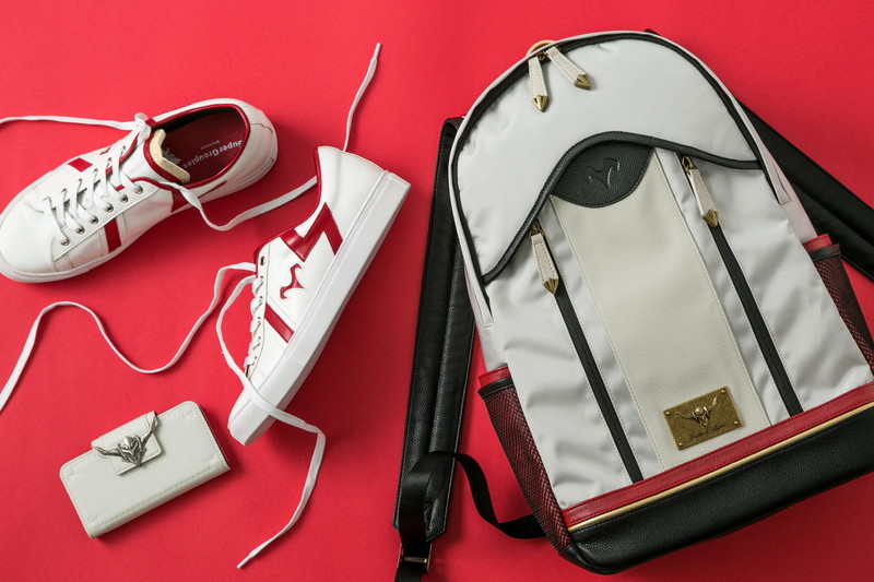 ルーラーの衣装をイメージしたカラーリングのバッグ・スニーカー・スマートフォンケース。 ルーラーのヘッドパーツや宝具“我が神はここにありて(リュミノジテ・エテルネッル)”のタグがデザインのポイントになっている。