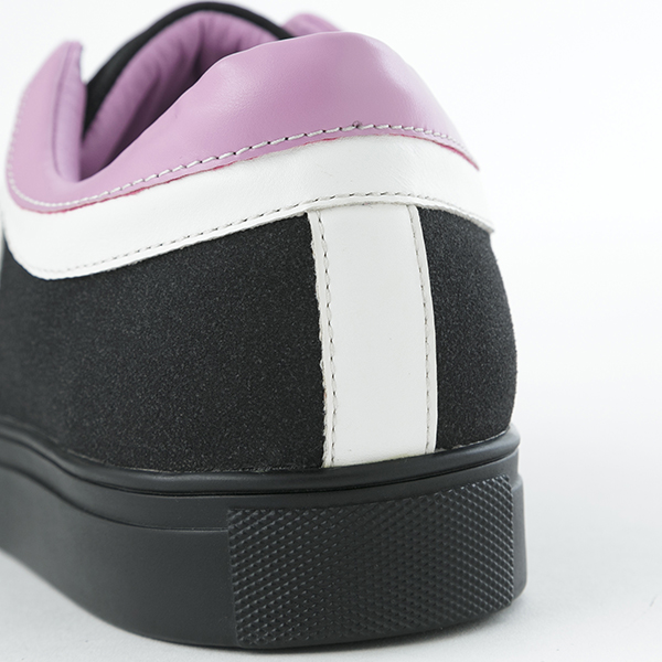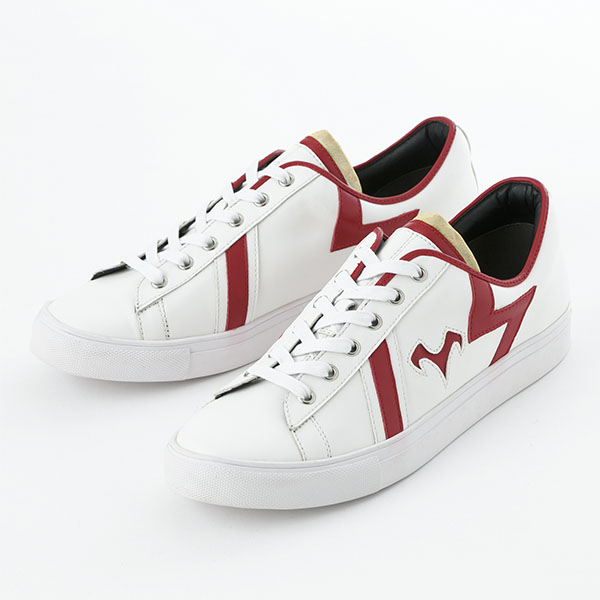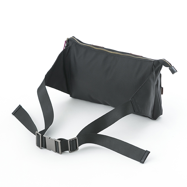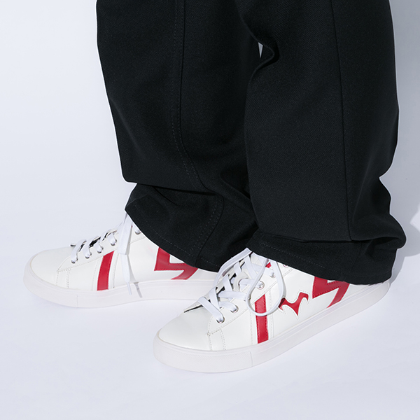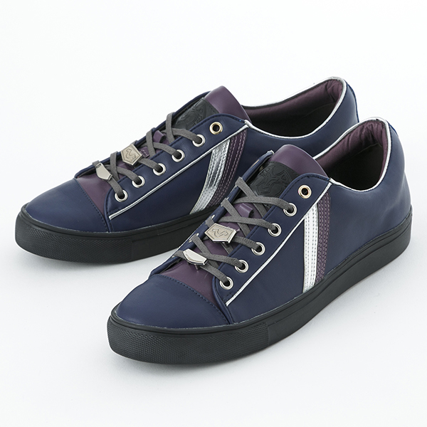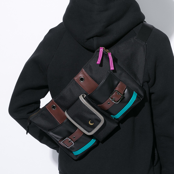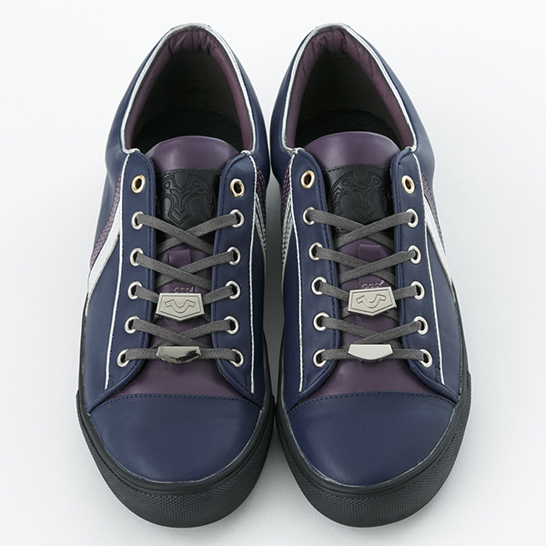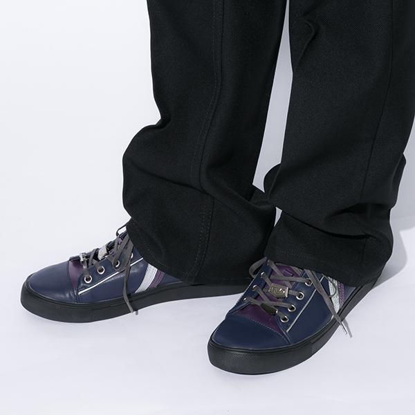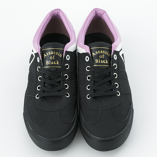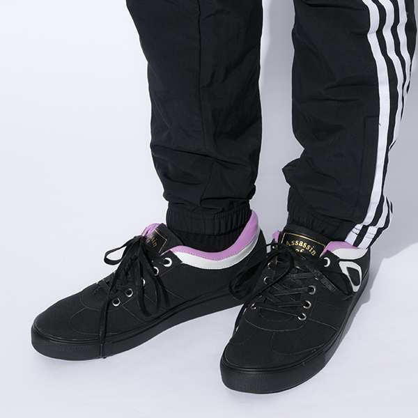 黒のアサシンの髪色と衣装をイメージしたカラーリングのアイテム。衣装のベルトやパーツをイメージしたデザインのバッグは、ウエストポーチ・ボディバッグの2way仕様。スニーカーのサイドに切り返しで表現したデザインは黒のアサシンの腰元のパーツがイメージされている。