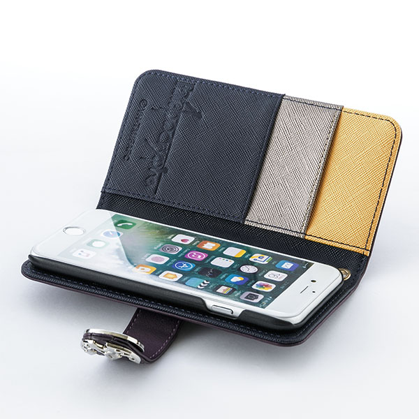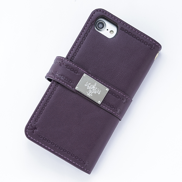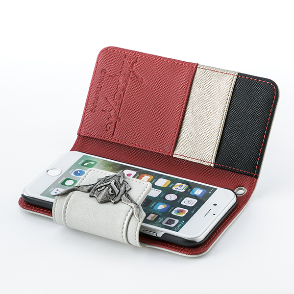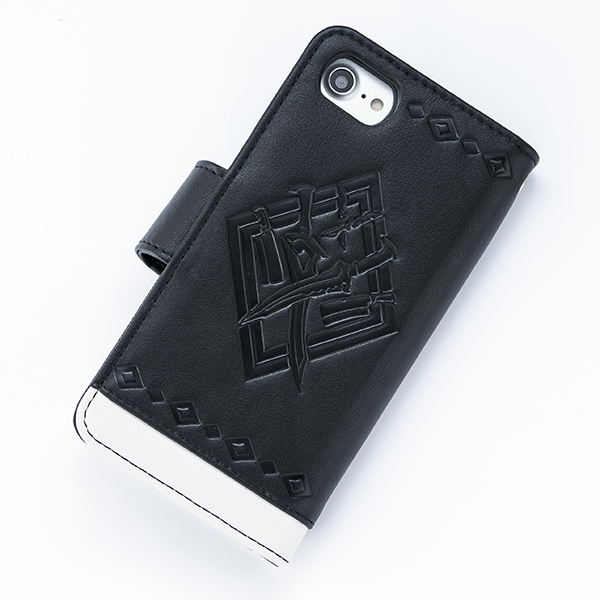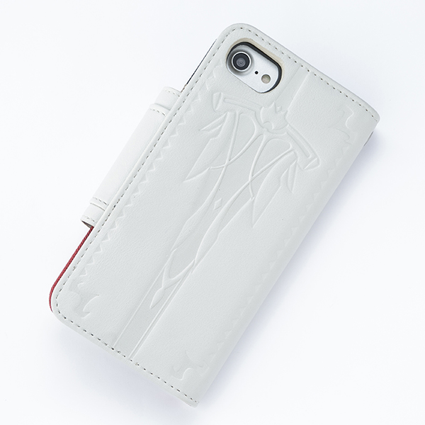赤のセイバーの鎧のパーツをイメージしたデザインのバッグは、不貞隠しの兜のマークと“Secret of pedigree”のパーツがポイント。スマホケースのフロントに大胆に施された“クラレント”と鎧の模様が赤のセイバーらしさ満点。フラップの不貞隠しの兜のシルバーのパーツがインパクト大。