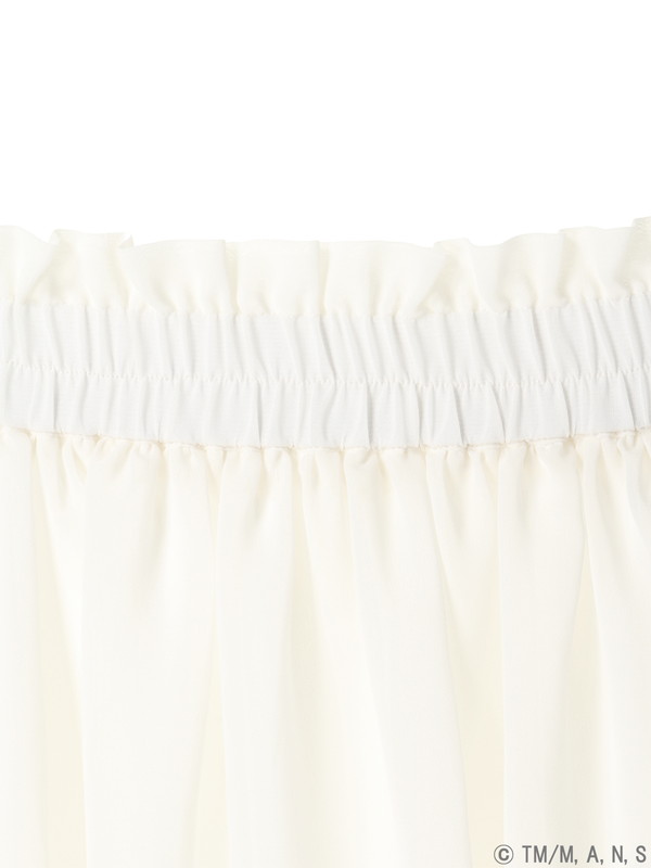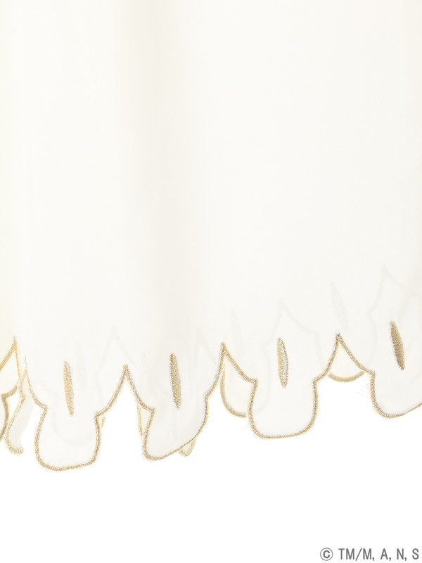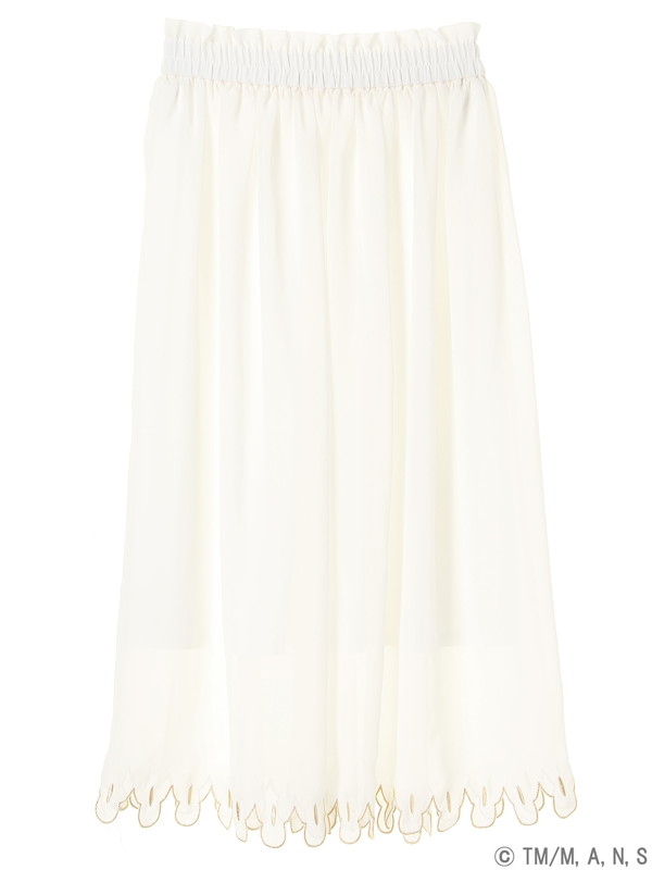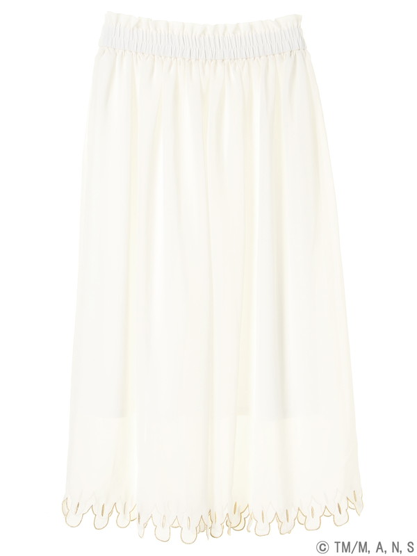 セイバーの衣装をイメージしたシフォンスカート。衣装の裾飾りをイメージした刺繍を金糸で施しポイントに。ウエストのフリルとセンシュアルな透け感のあるシフォン素材が女性らしい印象をプラス。ゴムウエストなのでリラックスした穿き心地ながらも、きれいめな印象を与えてくれる一枚。