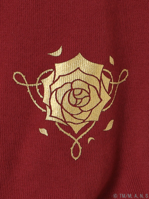 セイバーの衣装のイメージしたボルドーのパーカー。ユニセックスサイズが用意されている胸元にはボタン装飾をモチーフとした箔プリント、左袖にはタイトルロゴの薔薇のデザインの箔プリントが施されている。肩の切替線にもゴールドのサテンが挟み込まれ、ポイントに。普段使いはもちろん、イベントなどにも大活躍間違いなしの一枚だ。