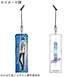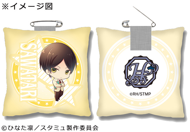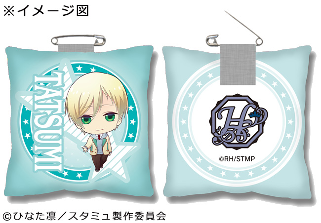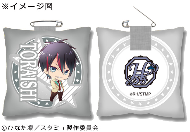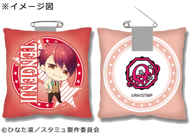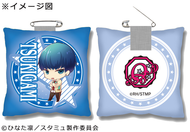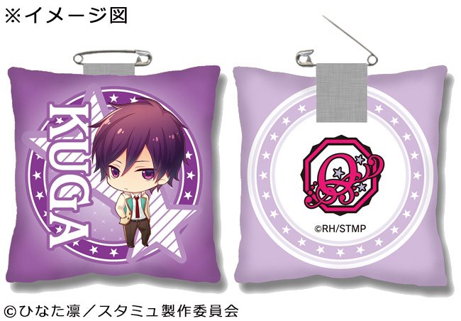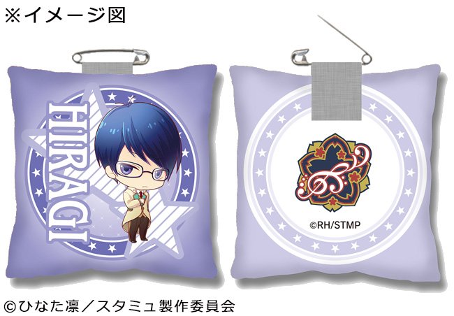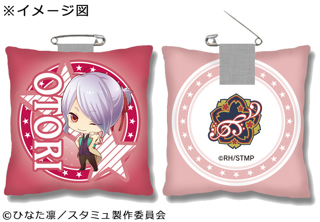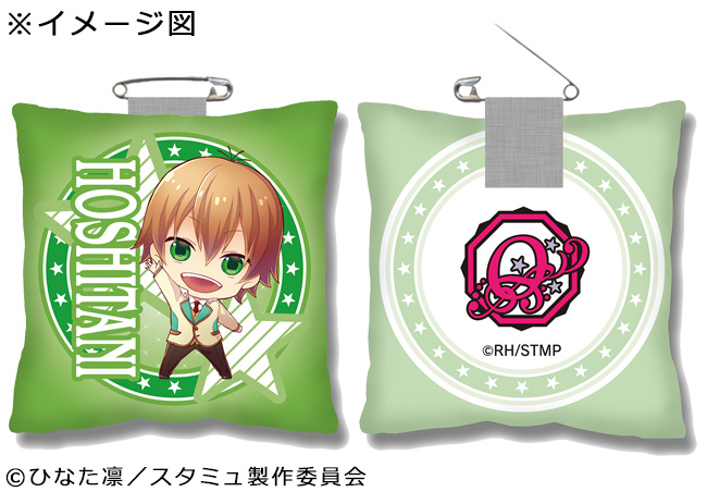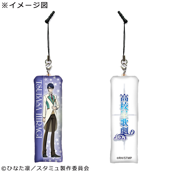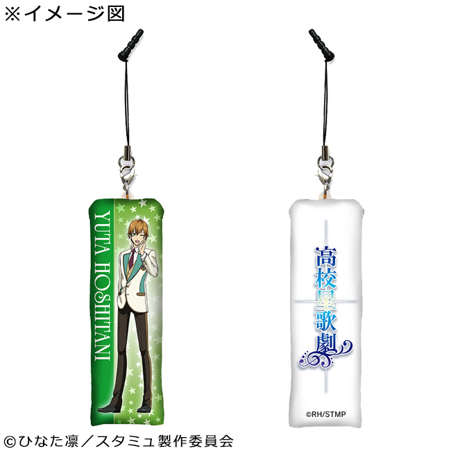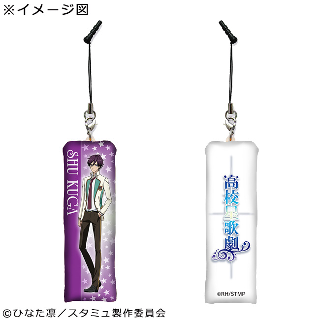 抱き枕型ストラップの表は制服姿のキャラクター、裏には『スタミュ』のロゴがデザインされている。