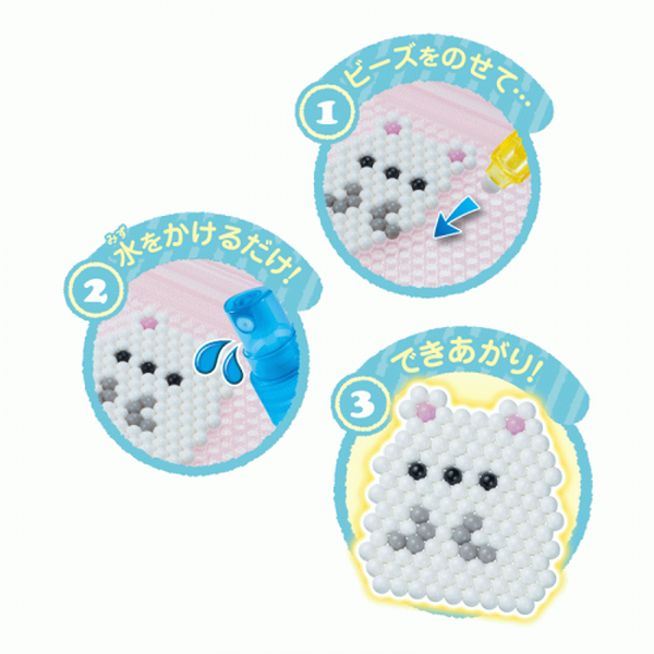 アクアビーズはお水でくっつく不思議なビーズです。作り方はとってもカンタン。ビーズを並べてお水をシュッとかけるだけ。ピーラーではがしたら、キュートなビーズアートの出来上がり!