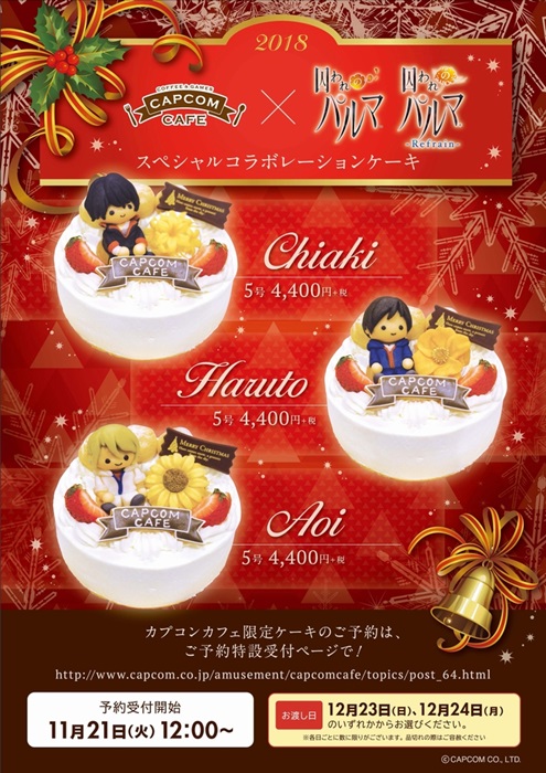 『囚われのパルマ』チアキ、ハルト、アオイのモチーフフラワーが美しいクリスマスケーキがカプコンカフェ限定で登場
