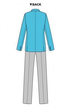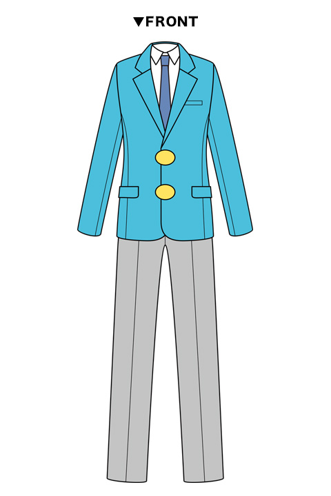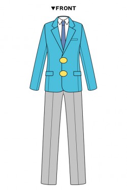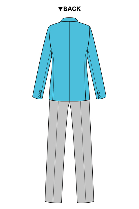 勝負服は、松野兄弟がここぞ!という日に着ているもので、独特な色味、デザインは、公式完全監修のもと、しっかりと再現されている。コロンとした、大きな楕円のボタンブローチつき。それぞれシルエットにもこだわった1着なので、兄弟が並ぶと圧巻だ。