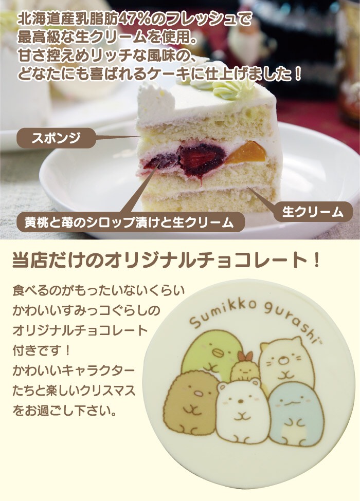 『すみっコぐらし』ケーキは、苺と桃と最高級生クリームにふわふわスポンジ。老舗菓子工房こいづみパティシエにより、味にも可愛らしさにもこだわって作られている。