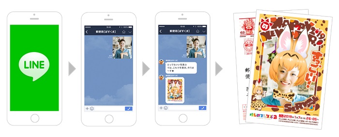 郵便局のLINE公式アカウントと友だちになり、トーク画面の下にあるメニュー“年賀状の作成”を押して、『けものフレンズ2』を選択。トークの内容に沿って顔の写っている写真を送ると、5〜10秒でデザインが自動生成される。写真と合わせて、新年のメッセージをテキスト入力できるタイプもあり、全8種類のデザインが登場する。