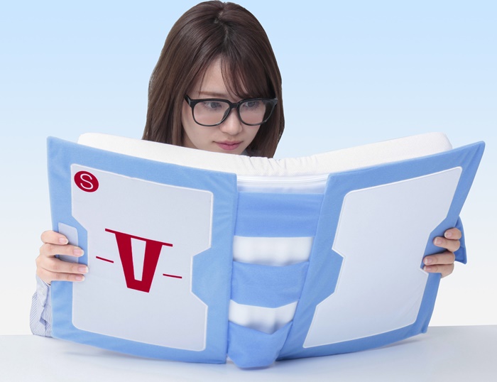 “V作戦マニュアル クッション”は、幅広い世代に人気の作品『機動戦士ガンダム』に登場するロボット兵器、モビルスーツ“ガンダム”の操作説明書“V作戦マニュアル”をモチーフにした本型クッション。閉じた状態ではデスクの傍らに本物の本のように立てて置くことができ、開くと縦約37cm、横約62cm、厚さ約6cmの大きなクッションになる。