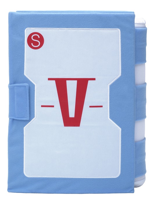 縁部分には水色を配し、表紙の中央に白地に赤で印象的なVの文字が記されている。開いた状態のクッション部分は、図解マニュアルをイメージしたようなデザインが施されており、“ガンダム”や戦闘機“コアファイター”が描かれている。