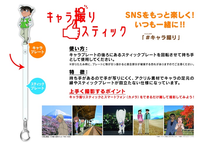 旅先や好きな場所とお気に入りのキャラクターを一緒に写真におさめて、撮影ができる“キャラ撮りスティック”シリーズに『名探偵コナン』が登場。普段は大きめのキーホルダーとしても使用可能だ。