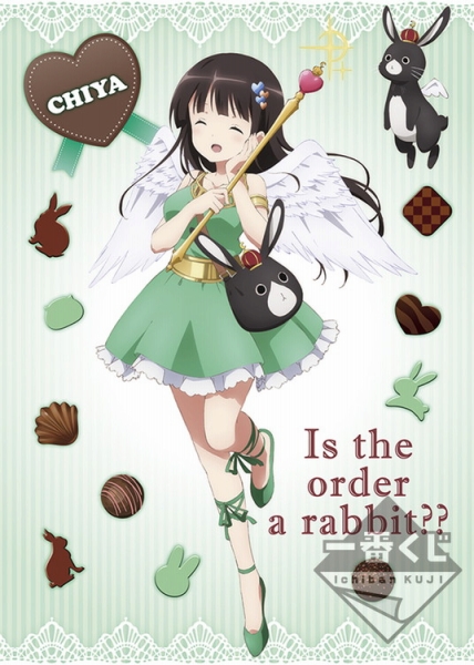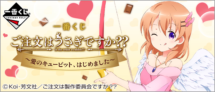『一番くじ ご注文はうさぎですか?? ~愛のキューピット、はじめました~』が2019年1月12日(土)より、ローソン、ミニストップ、その他コンビニエンスストア、書店、TSUTAYA、ホビーショップ、ゲームセンターなど(※店舗により取り扱いのない場合や発売時期が異なる場合がある。なくなり次第終了。)で順次発売される。価格は1回620円(税込)。