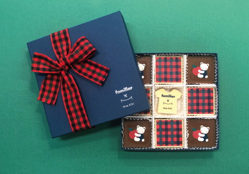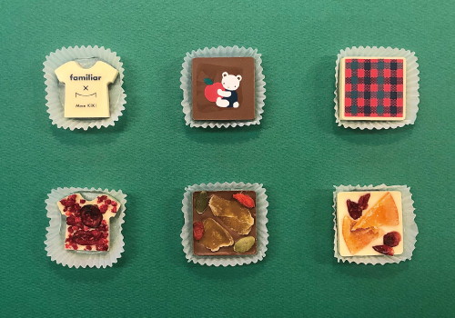 ドライフルーツを合わせたオリジナルデザインのマカダミアンチョコレート。甘さを控えた繊細な香りとなめらかな舌触りのホワイト・チョコレートには爽やかな香りのオレンジを合わせたファミリア定番のハウスチェック柄を。クランベリーとフランボワ―ズの甘酸っぱいベリー系は、familiar×Mme KIKIのオリジナルTシャツ型。バニラの香り高いミルクチョコレートにはファミちゃんの大好きな林檎をトッピングし、まろやかでジューシーな味わいを楽しめる。