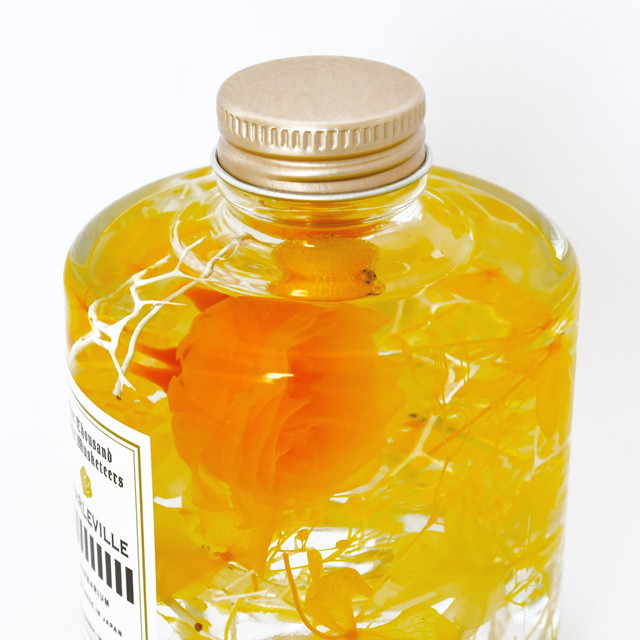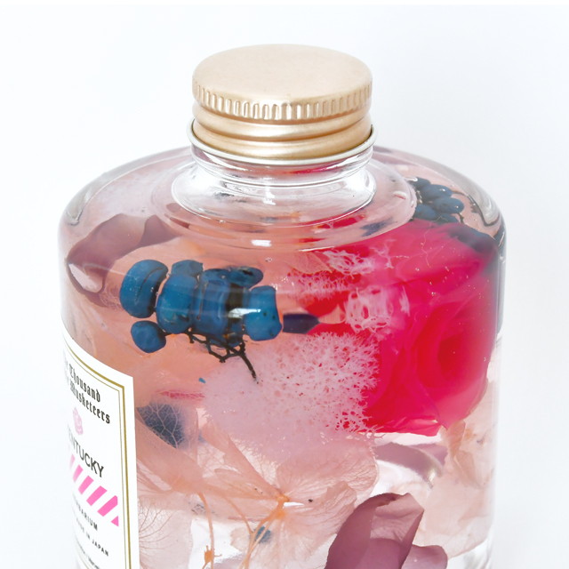 硝子の瓶に入ったオイルと花は、光の角度によって表情が変化。晴れの日、曇りの日、雨の日、それぞれ気候や光の環境によってデザインが変わるのがポイントだ。