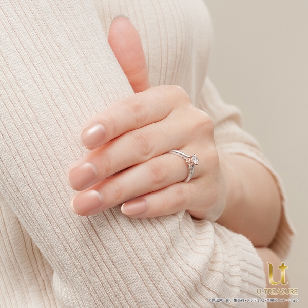 本商品は、チョッパーとDr.ヒルルクとの想いをつなぐ“桜の花びら”と、彼からもらった“帽子”をデザインしたエンゲージリングだ。チョッパーの原点ともいえる想い出深いストーリーをモチーフにしたリングとなっている。