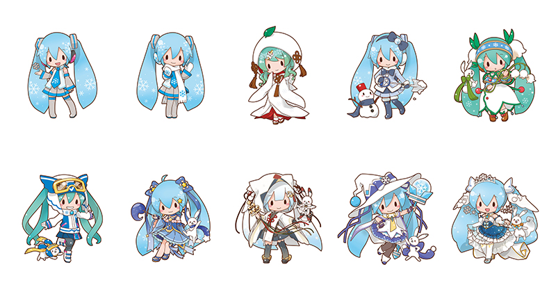 歴代の“SNOW MIKU(雪ミク)”が三月八日氏のデフォルメイラストでアクリルキーチェーンマスコットに。