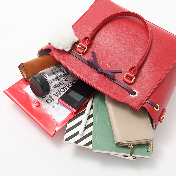 真っ赤なボディにパープルの細いリボンと、犬耳のファーチャームがついたキュートなトートバッグ。シンプルコーデのポイントに。真っ赤なコーデに合わせてアニメバウンドに。ショルダーストラップ付きで斜め掛けも可能。毎日の冒険のお供にピッタリだ。