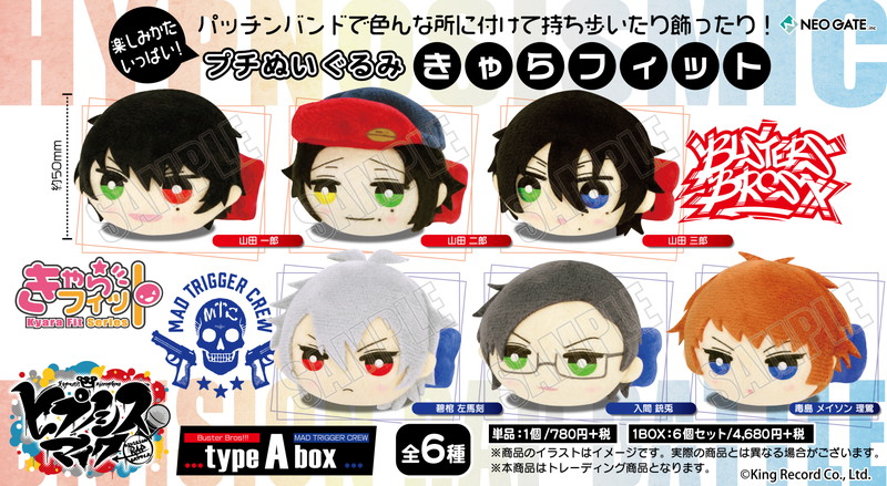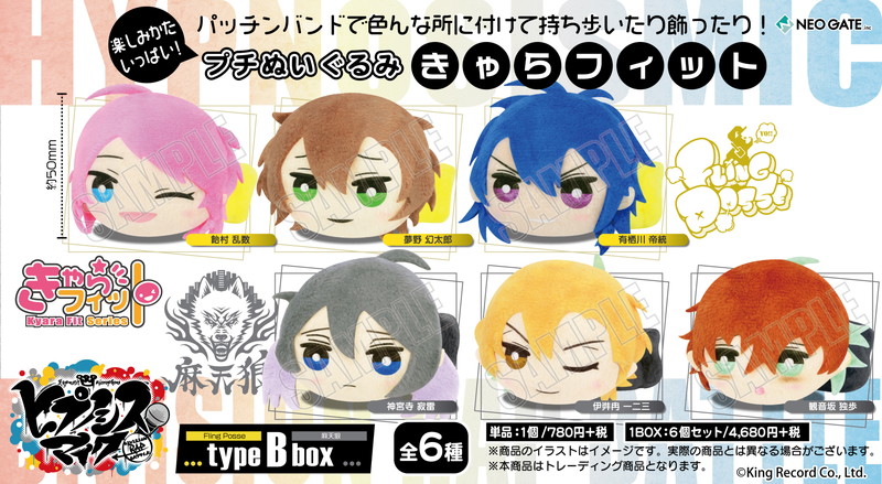 typeA boxには山田一郎、山田二郎、山田三郎、碧棺左馬刻、入間銃兎、毒島メイソン理鶯の全6種、typeB boxには飴村乱数、夢野幻太郎、有栖川帝統、神宮寺寂雷、伊弉冉一二三、観音坂独歩の全6種から、それぞれランダムで1つ封入される。単品での購入はもちろん、BOXで購入の際は封入キャラクターをコンプリートすることができる。