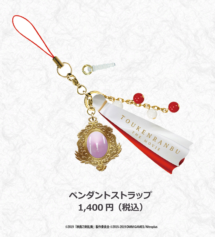 キヤノンが開発した高品位美術印刷技術により、高品質・高細にて印刷した“キャラファイングラフ”から、刀剣男士8振りが登場するキービジュアルと、上映劇場で展示されたバナービジュアルの8振りを商品化。額装・ シリアルナンバー付でお届け。さらに、“ペンダント”をモチーフとした“ペンダントストラップ”と、刀剣男士8振りの“ビーズチャーム【全8種】”も販売。“ペンダントストラップ”のチャーム部分は、メタル製の台座に模造石を埋め込み、朱と白のリボンとビーズをあしらわれている。“ビーズチャーム”は、中央部分のビーズには“紋”を、周りを囲むビーズとタッセルは各刀剣男士のイメージカラーを使用。ともに作品の世界観が楽しめるアイテムとなっている。